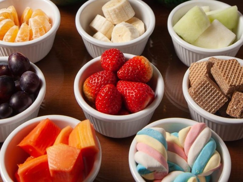 **FONDUE DE CHOCOLATE: **Chocolate preto acompanhado de frutas da estação, marshmallow, waffer.